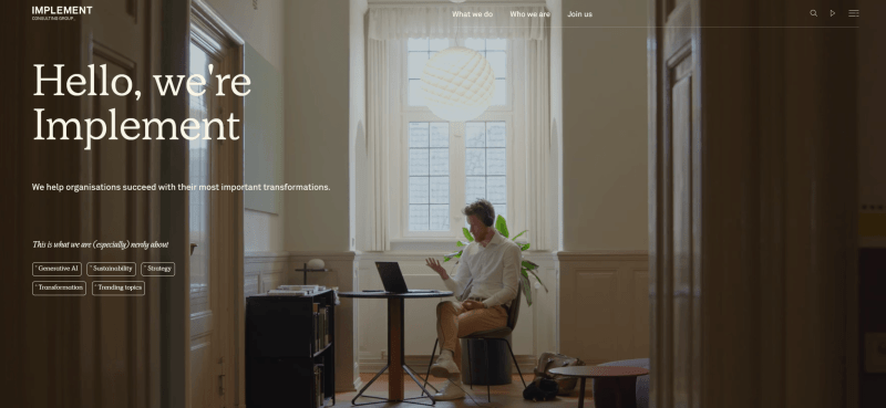 Implement is another consulting website that caught my attention with its subtle parallax effect and very clean design. The overall style is snow-white, complemented by bright, colorful photos that add contrast and keep the page visually engaging.