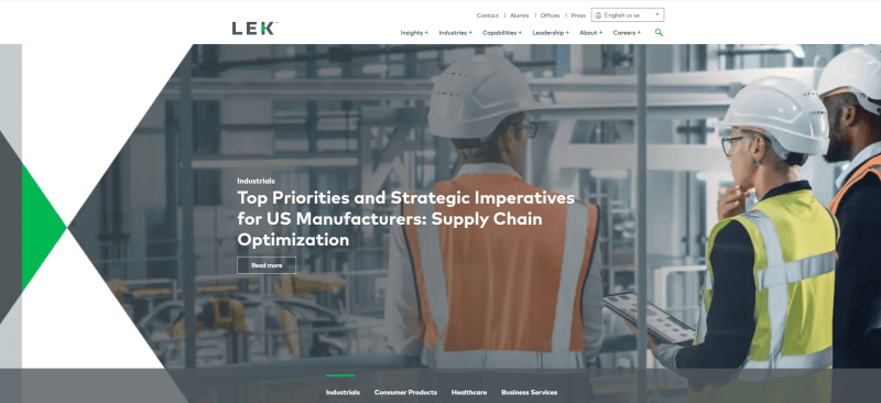 L.E.K.’s website immediately gives the impression of a professional and content-rich consulting firm. The homepage includes the latest news, videos, career opportunities, case studies, and more — each section has a clear button to learn more, which makes navigation straightforward.