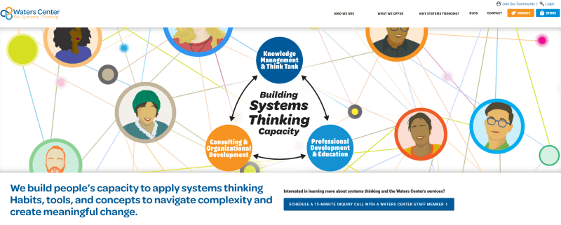 Waters Center uses bright, colorful elements and photos to present its consulting approach in a clear and engaging way. It focuses a lot on helpful materials – visitors can easily download free resources and start learning about the system.