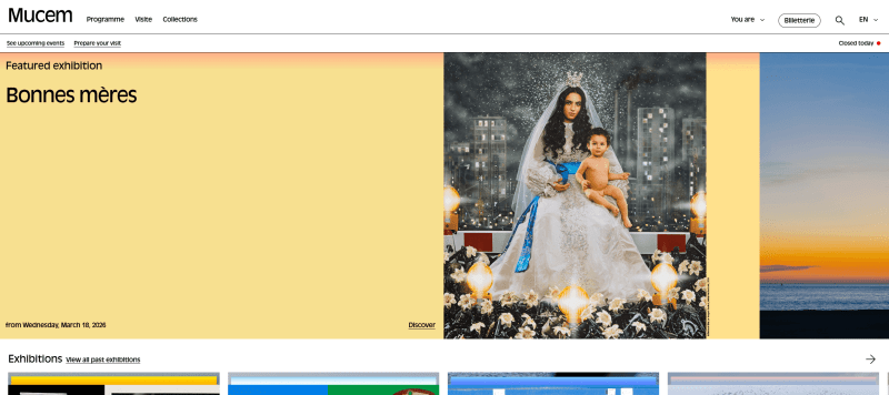 Closer to the footer, just below the news section, there are dedicated options for different visitor categories. You’ll also find links to social media, press reviews, government contracts, work and training opportunities, “Friends of Mucem,” and other useful sections, all well-organized and easy to access.