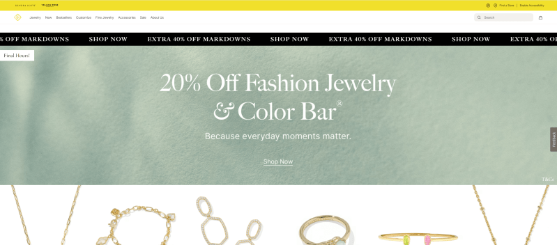 The most notable features of the Kendra Scott website are a convenient search bar and live chat. These tools make it easy for users to quickly find products or reach out if they need more details. Each section combines images with buttons that lead to dedicated pages such as Birthdays, New Arrivals, and more.