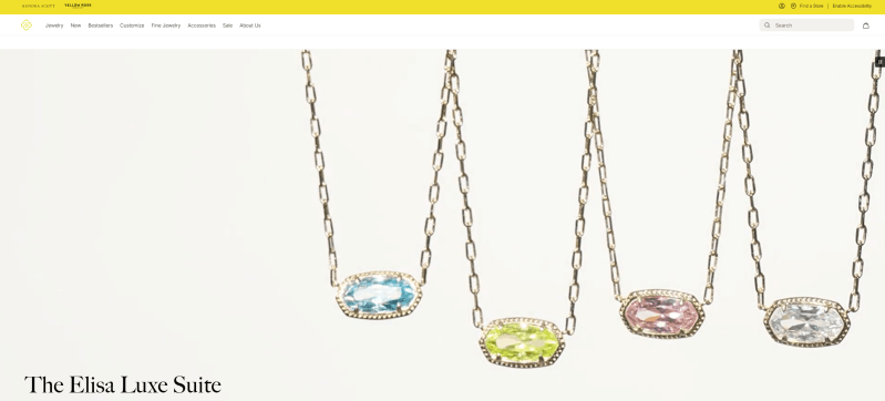 The most notable features of the Kendra Scott website are a convenient search bar and live chat. These tools make it easy for users to quickly find products or reach out if they need more details. Each section combines images with buttons that lead to dedicated pages such as Birthdays, New Arrivals, and more.