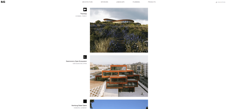 BIG is one of the most creative architecture firm website examples I’ve come across recently. It feels bold and very memorable – even though it looks a bit experimental at first, it perfectly reflects the firm’s open-minded approach to style.